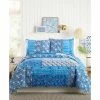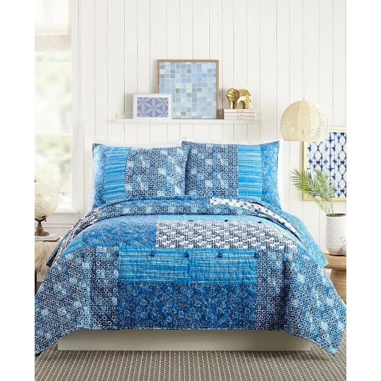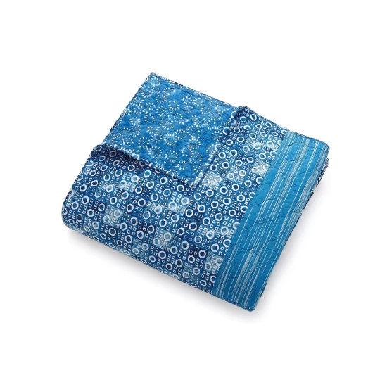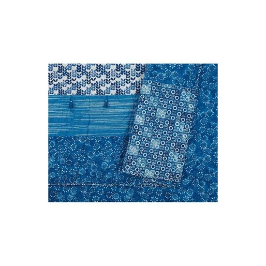 The Jessica Azra Quilt is made of pieced cotton fabrics all printed with block print inspired motifs in shades of indigo blue for a perfectly zen bedroom look. Indigo blue tassels finish off the look.