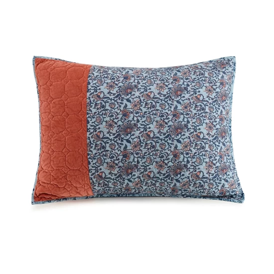 A new and exotic pieced sham with the look of hand crafted Indian prints from Jessica Simpson. Coordinating backing print is a rich floral with intertwined vines in shades of indigo blue. Big blocks of small textured floral prints in desert spice and blue are pieced together in a bold pattern. Coordinating backing print is a rich floral with intertwined vines in shades of indigo blue.