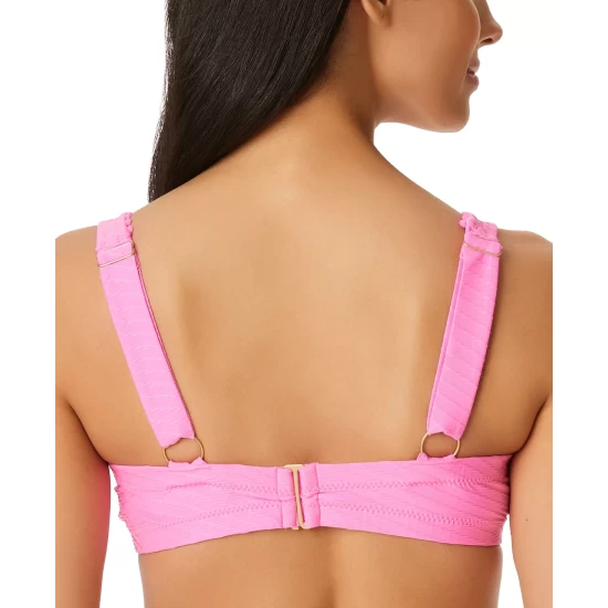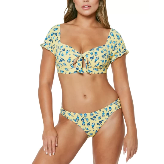 Vintage-inspired florals drift across textured fabric, bringing a look both retro and fresh to this puff-sleeve bikini top and matching bottoms from Jessica Simpson.