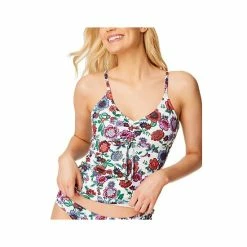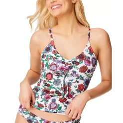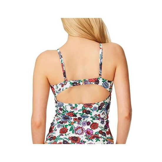Chic coverage is achieved with this Jessica Simpson tankini swim top featuring tie front detail and cutout design on the back.
