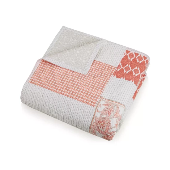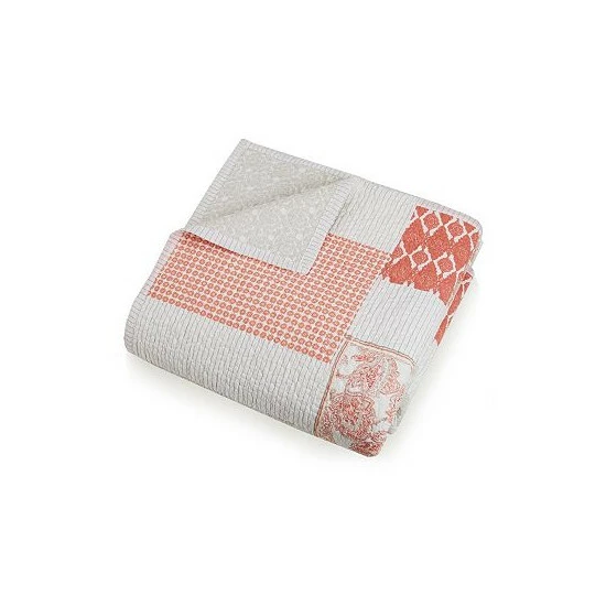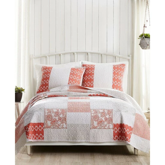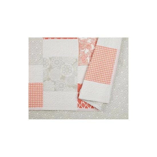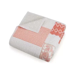 Inspired by vintage silk scarves the Jessica Simpson Lago Quilt features pieced cotton fabrics with bohemian, feminine prints in shades of dusty grey and coral.ย