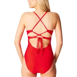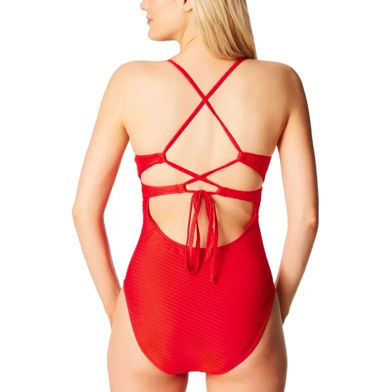 Subtle details including a keyhole front and twisted fabric at the V-neck plunge of this Jessica Simpson one piece swimsuit brings a refresh to your poolside options.