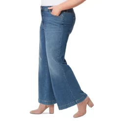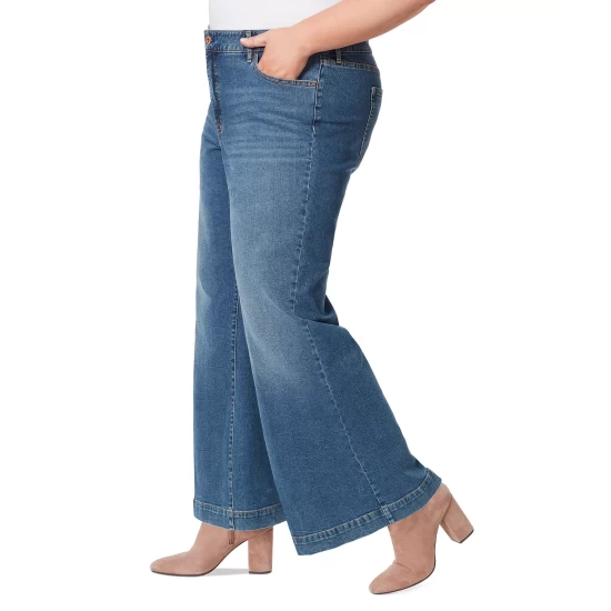 Be perfectly in style for casual looks: Jessica Simpson’s plus size jeans feature a trouser-style wide-leg silhouette.