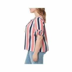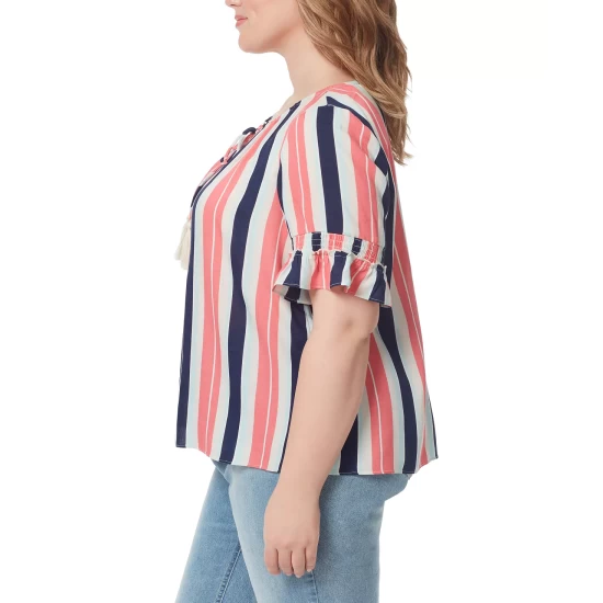 Jessica Simpson’s plus size peasant top is super stylish and designed to wow with pretty details such as paper-bag ruffle sleeves and a keyhole neckline with tassel details.